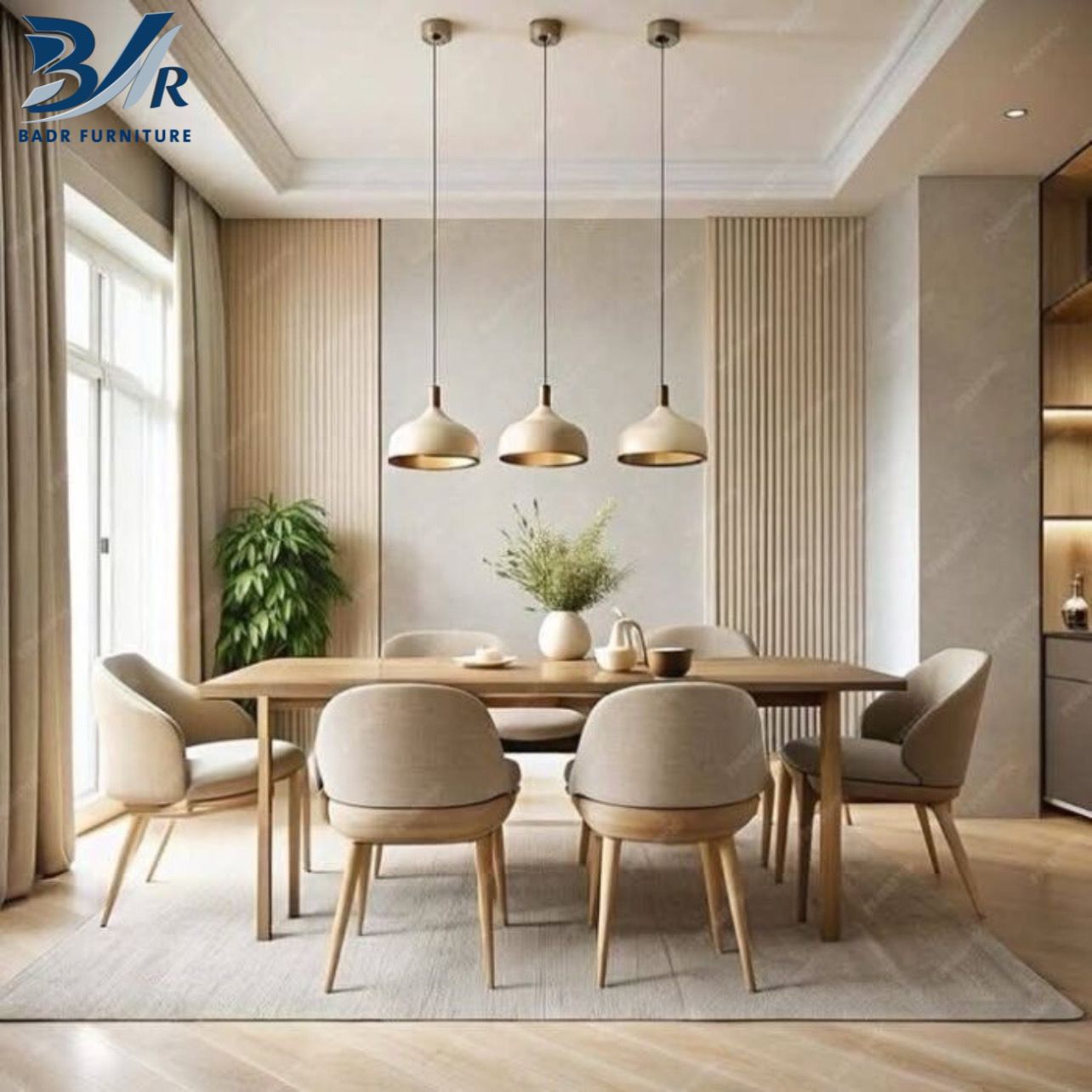 سفرة بتصميم مودرن راقي يتميز بخطوط ناعمة وأرجل منحنية تضيف لمسة فنية مميزة، مصنوعة من خشب الزان الطبيعي مع سطح أملس وتشطيب عالي الجودة. الكراسي بتصميم مريح وعملي يناسب الاستخدام اليومي ويكمل شكل السفرة بانسجام تام.