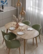 سفرة بتصميم مودرن ناعم بحواف دائرية تضيف إحساس بالراحة والأمان، مصنوعة من خشب الزان الطبيعي مع تشطيب عالي الجودة. الكراسي مريحة بتنجيد أنيق يكمّل شكل السفرة ويجعلها مناسبة للاستخدام اليومي والعزومات.